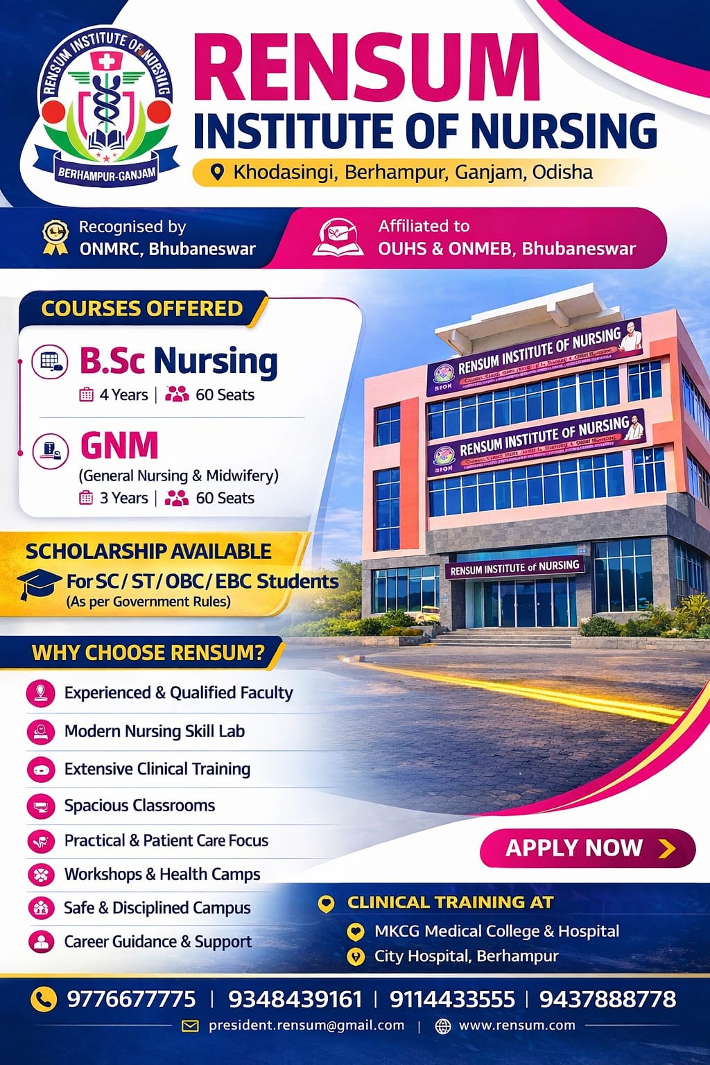 Rensum Institute Of Nursing was started from 22.09.2023 Recognised by Health and Family welfare department, ONMRC, Bhubaneswar and began with few students at Berhampur, Ganjam. Shri Suman Kumar Senapati is the founder of this college with his great vision of transforming education in society. The birth, growth and development of the College is a cumulative result of the immense sacrifice, dedication, hard work and perseverance of a good number of well meaning selfless individuals.